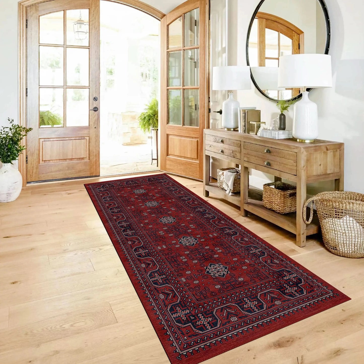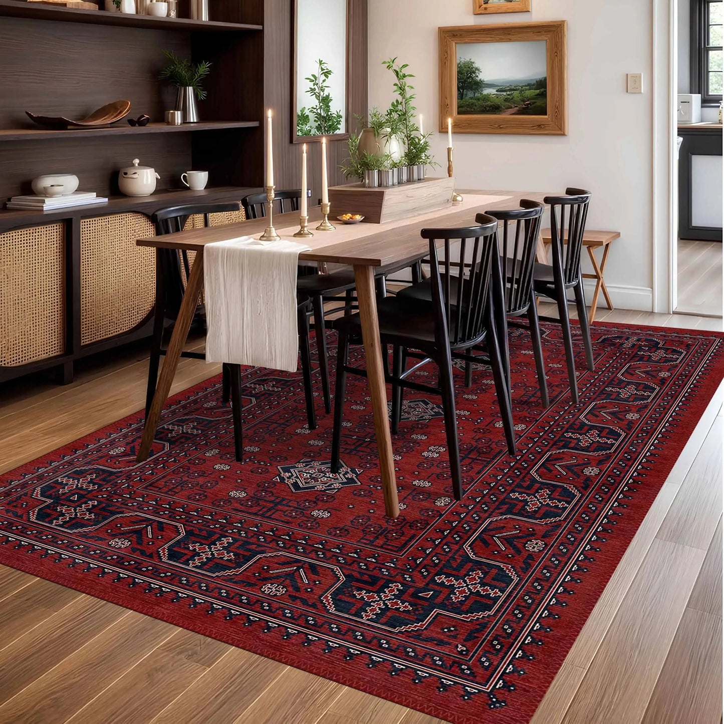 Kırmızı ve toprak tonlarının uyumu, bulunduğu ortama sıcak bir atmosfer kazandırırken klasik Afgan desenleri mekânınıza otantik bir dokunuş ekler. Salon, oturma odası veya çalışma alanlarında dikkat çekici bir merkez oluşturur ve zamansız bir estetik sunar.