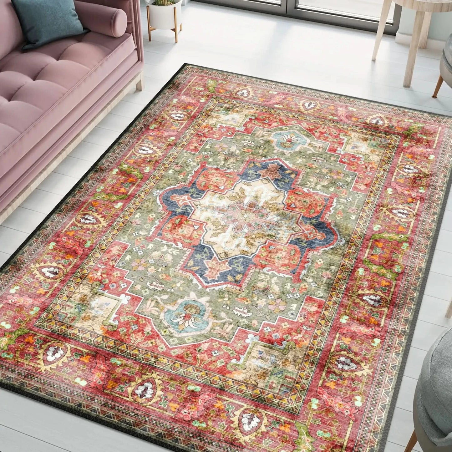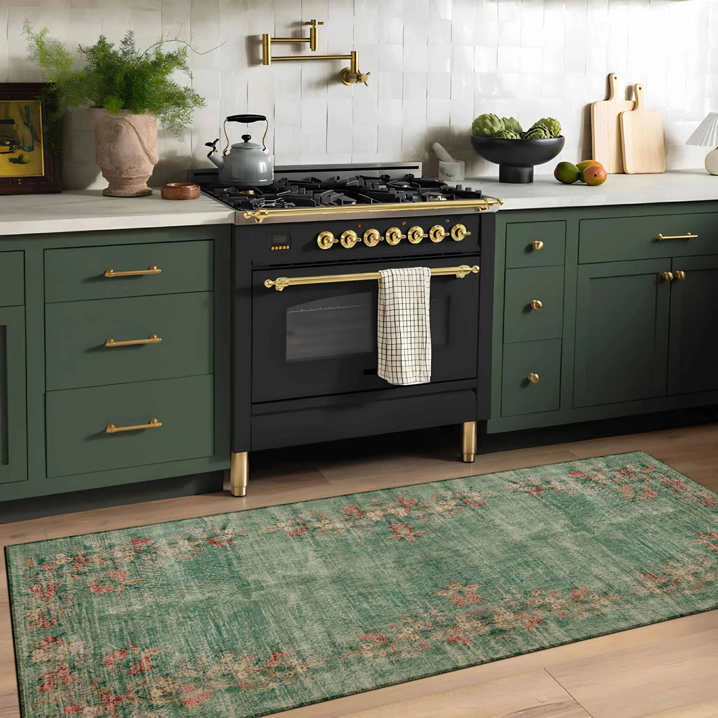 Antik Zeytin Yeşili Vintage Halı – Yıkanabilir & Şık Tasarım