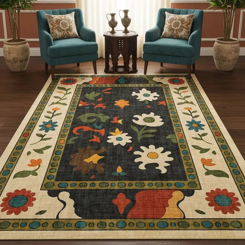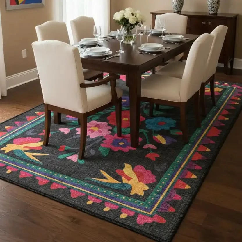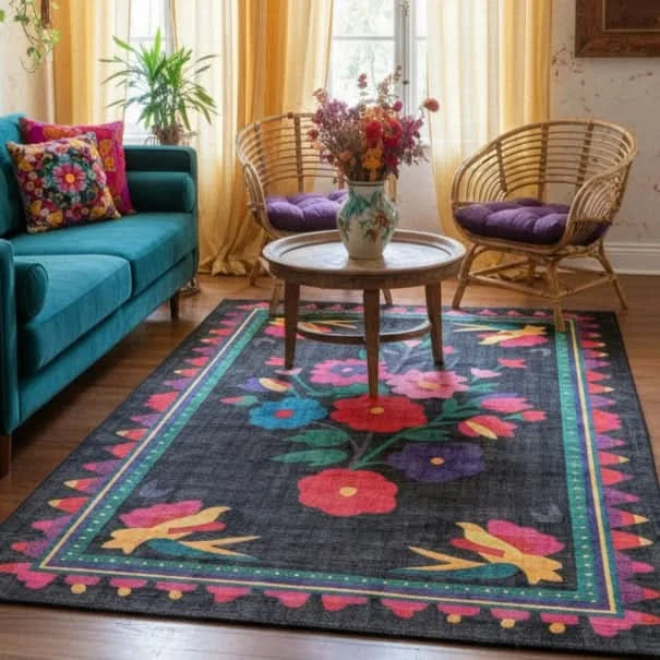 Egzotik ve Şık - Tropik Desenli Siyah Halı - NW 149